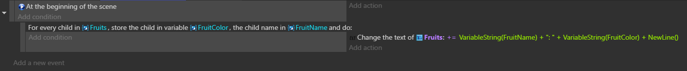 This event stores the value of each child variable (as a string or number) and the name of the child variable (as a string) into the scene variables you specify in the parameters of the event.