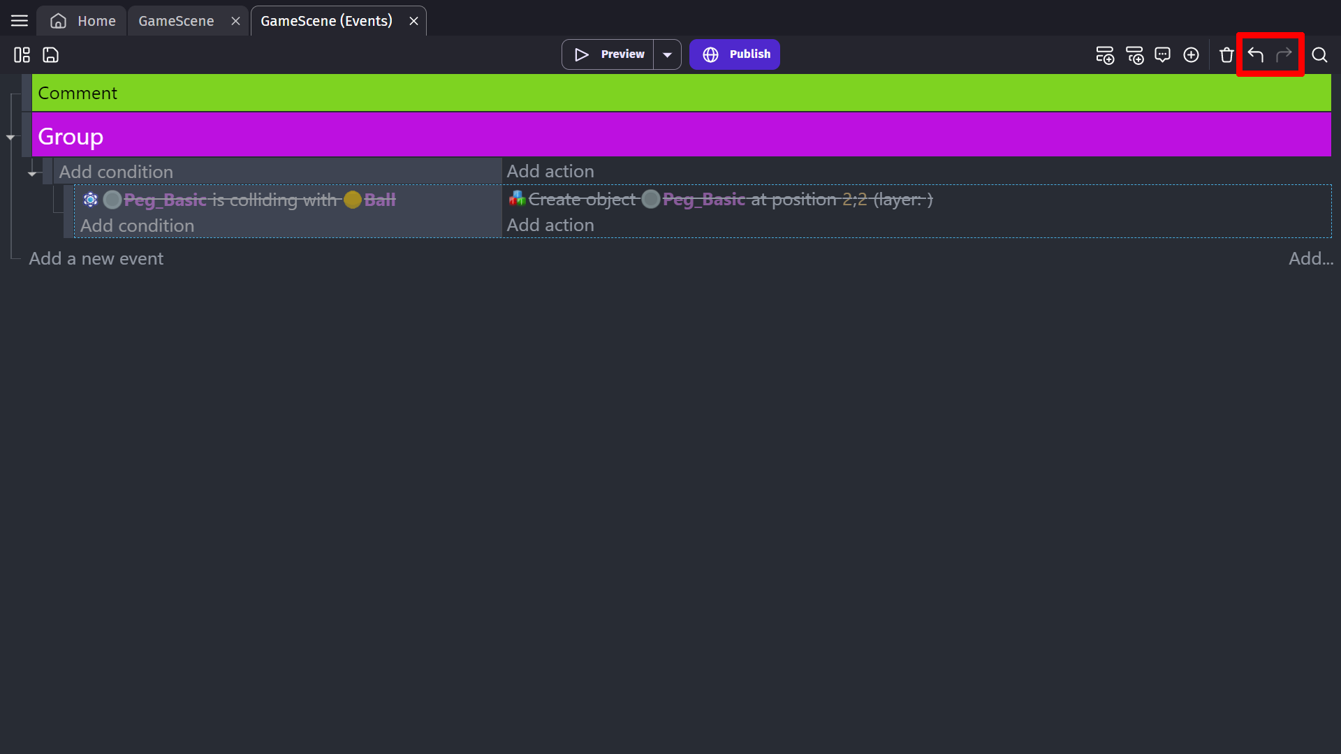 You can add any number of event blocks to the Event editor. Each event can have various conditions and actions. Once you add an event, you can use the conditions and actions to create the game's logic. Read more about conditions and actions.