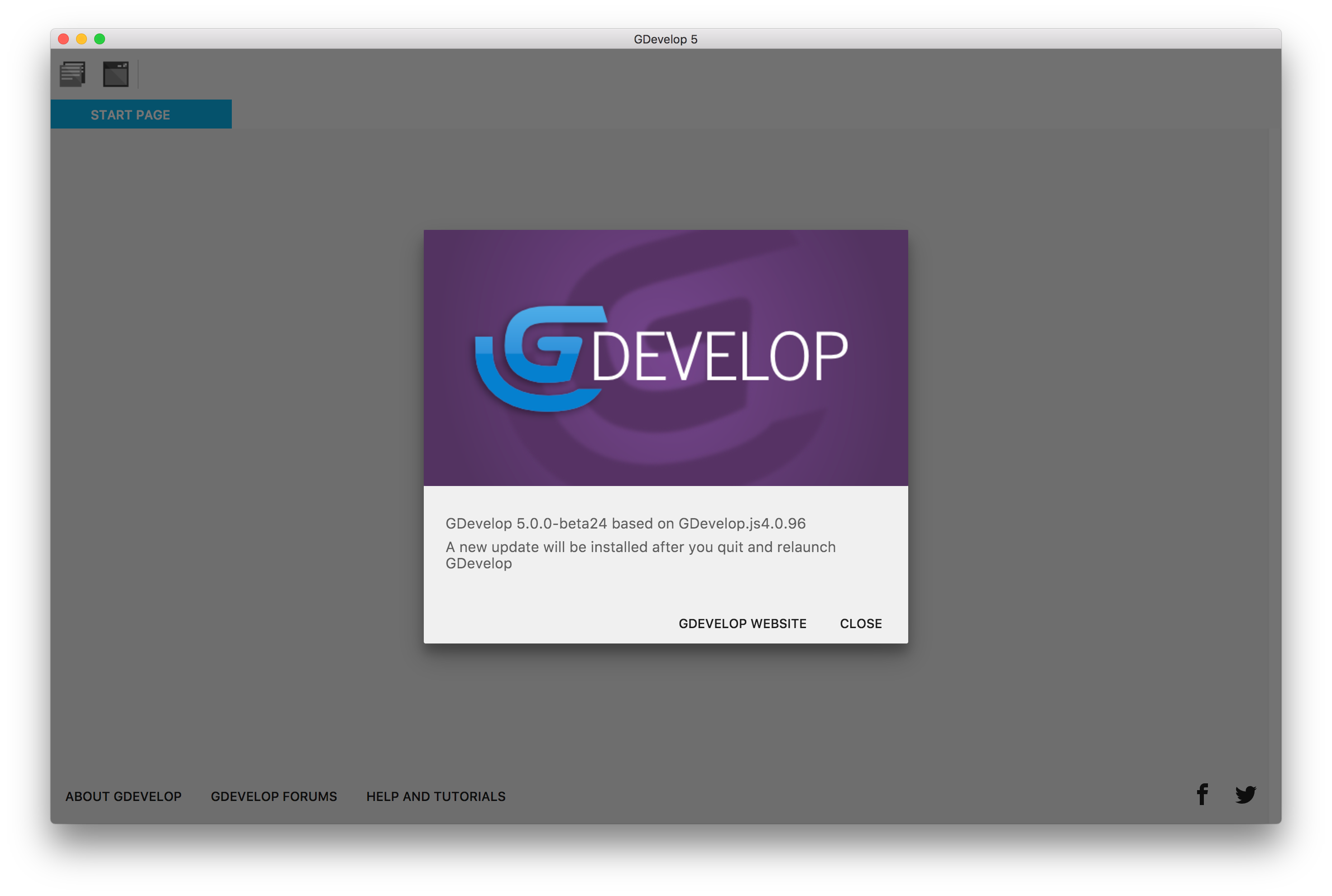 When started, GDevelop automatically search for new updates. You can see the progress by clicking on About GDevelop in the start page or in the menu.